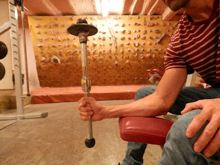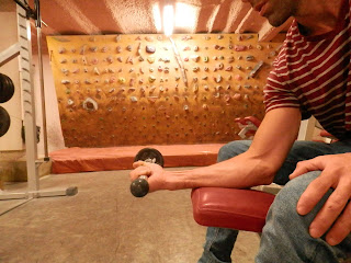 Para realizar este ejercicio deberás estar sentado con el brazo doblado en un ángulo de 90° y apoyado en una superficie. Agarra el extremo sin peso de la barra y gírala hacia arriba y hacia abajo desde la posición del pulgar hacia abajo hasta la del pulgar hacia arriba. Continua girando la muñeca hacia arriba y hacia abajo hasta hacer de 15 a 20 repeticiones. Realiza 2 series 2 veces en cada entrenamiento; de hecho, puede ser mejor realizar 2 series al principio y al final de cada actividad de escalada. Varia la resistencia, bien añadiendo peso, bien colocando la mano mas lejos del extremo con peso.