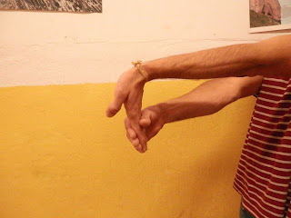 Estira un brazo y cierra el puño (del brazo que vas a estirar). Coloca el puño en la palma de la otra mano y suavemente tira de el hacia dentro, de modo que se estire la parte trasera del antebrazo. Mantén el estiramiento de 15 a 20 segundos, después de los cuales has de rotar el antebrazo de modo que trabaje el estiramiento con el puño girado hacia arriba, hacia dentro y hacia abajo. Repite este estiramiento dos o tres veces con cada brazo. Es un estiramiento fundamental para prevenir la tendinitis de codo.